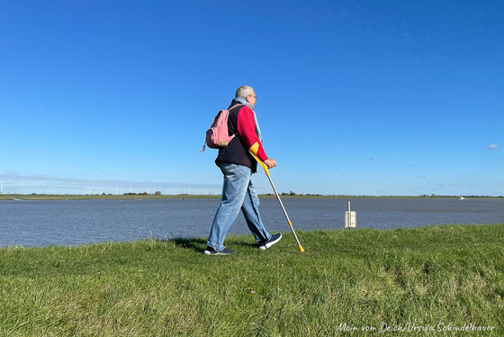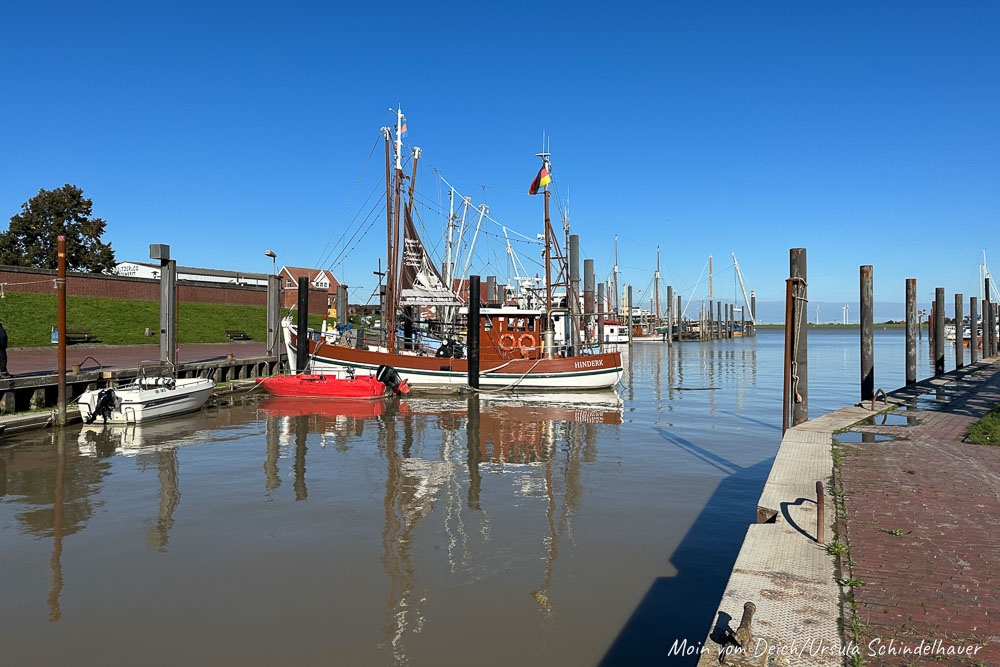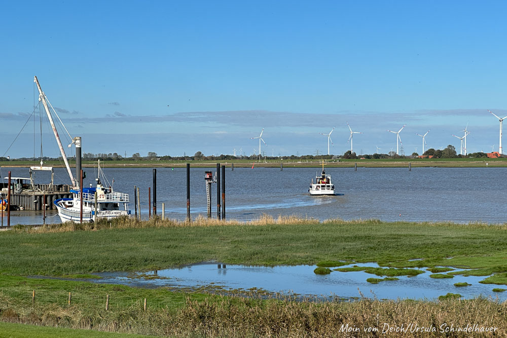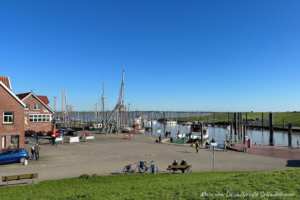 Die Bilder sind so, wie wir gelaufen sind, also zuerst durch den Hafen, dann am Wohnmobilplatz vorbei, durchs Dorf über die Hühnerbrücke zum Edeka, von da aus zum Schöpfwerk und dann über den Deich nach Hause.
