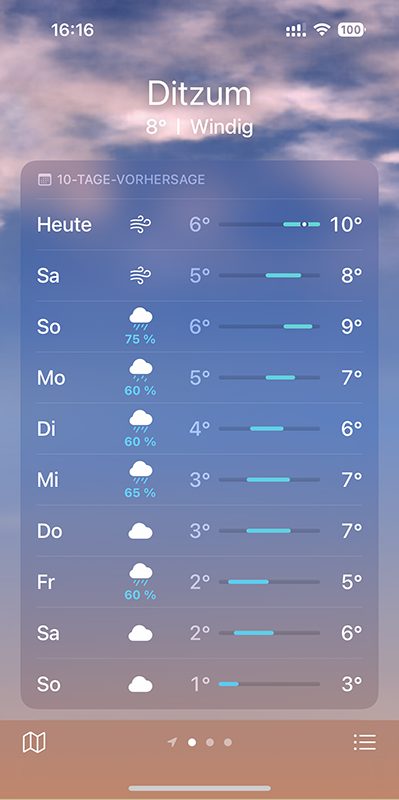 Gegen kalt habe ich gar nichts, aber Sturm und Regen sind schon eine ungünstige Kombination. Heute morgen war es ordentlich windig, aber wir hatten neun Grad und es war trocken. Der Himmel zeigte sogar immer wieder blaue Stücke - also sind wir losgezogen. Im Moment muss man wirklich jeden schönen Moment nutzen, denn die nächsten Tage sieht es auch nicht viel besser aus, zumindest nicht laut meiner Wetter-App.