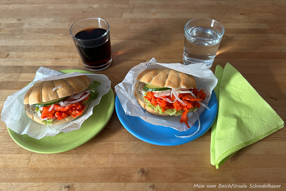 Wenn man denn schon mal draußen ist, kann man natürlich auch noch eine kleine Runde drehen oder muss man sogar; sich nur für den Briefkasten in warme Jacke, Schal, Mütze und sonstige wärmende Utensilien zu werfen, wäre ja Verschwendung. Und weil wir schon mal draußen waren, haben wir beschlossen, dass uns eine letzte Schleife in den Hafen ins Fischhaus führt, um uns zwei Seelachsbrötchen zu holen. Die lieben wir und futtern sie regelmäßig mit viel Appetit.