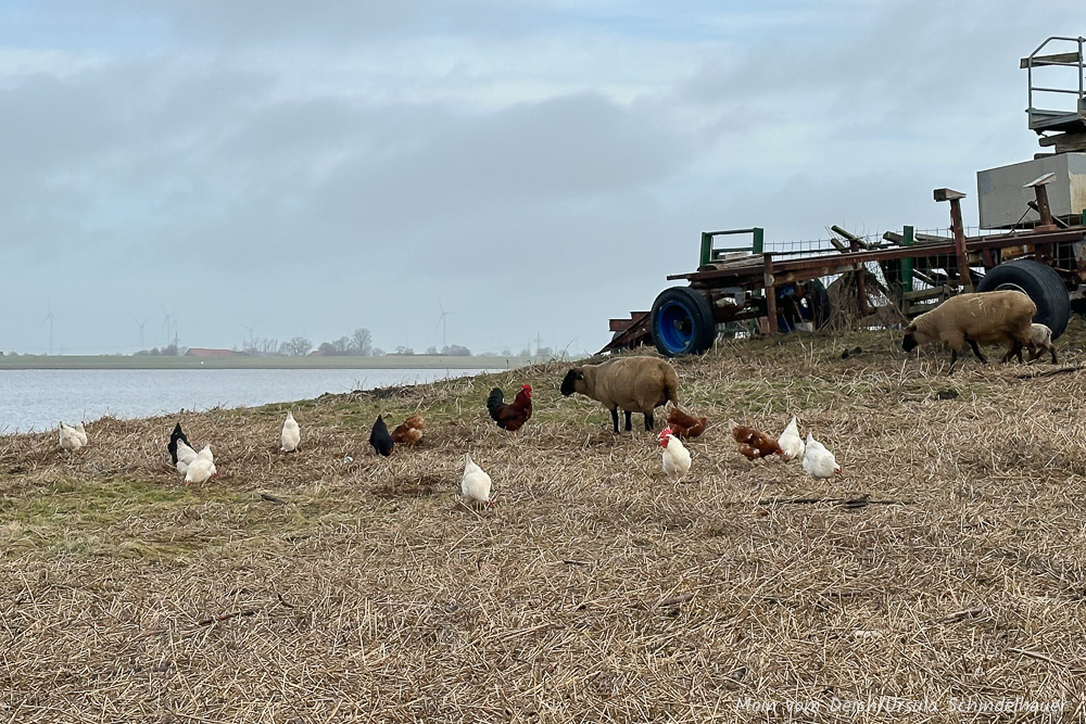 Heute habe ich mit der ganz neuen Brille unsere Werfthühner, ein paar Schafe, den Hafen und ein bisschen was vom Dorf angeschaut und es war genauso schön wie immer. Auf dem Werftgelände sind zur Zeit die werdenden und gerade gewordenen Schafmamas untergebracht und das Zusammenleben mit den Werfthühnern scheint sehr gut zu klappen. Hin und wieder muss zwischen dem dunklen Hahn und einem der Schafe geklärt werden, wer das Sagen hat - heute morgen hat der Hahn gewonnen und das Schaf hat abgedreht.