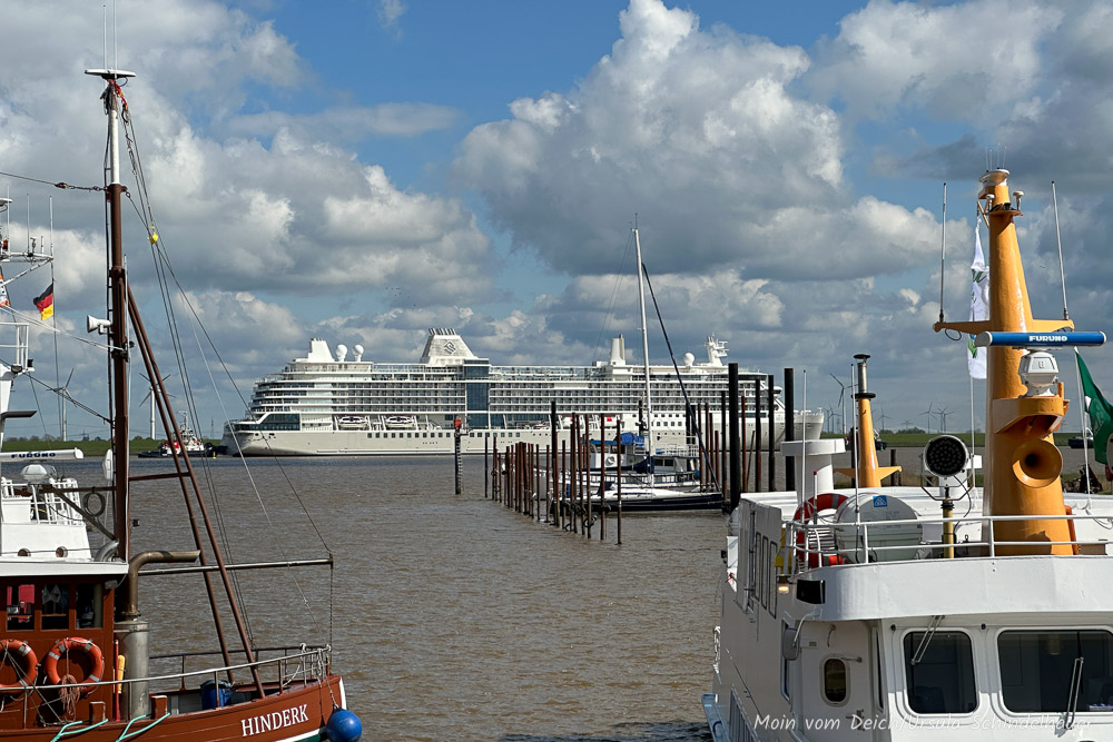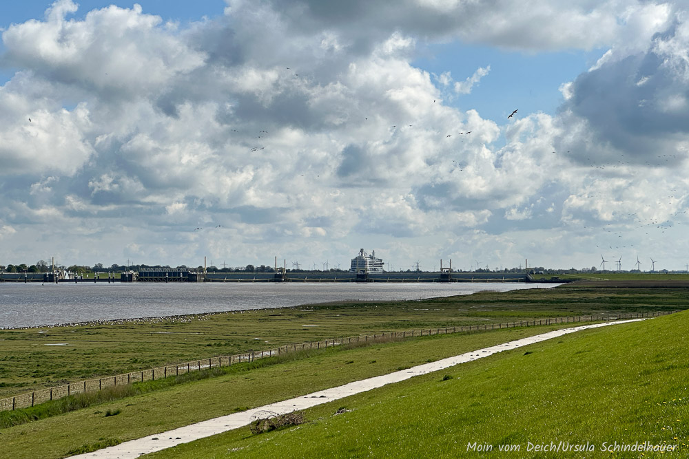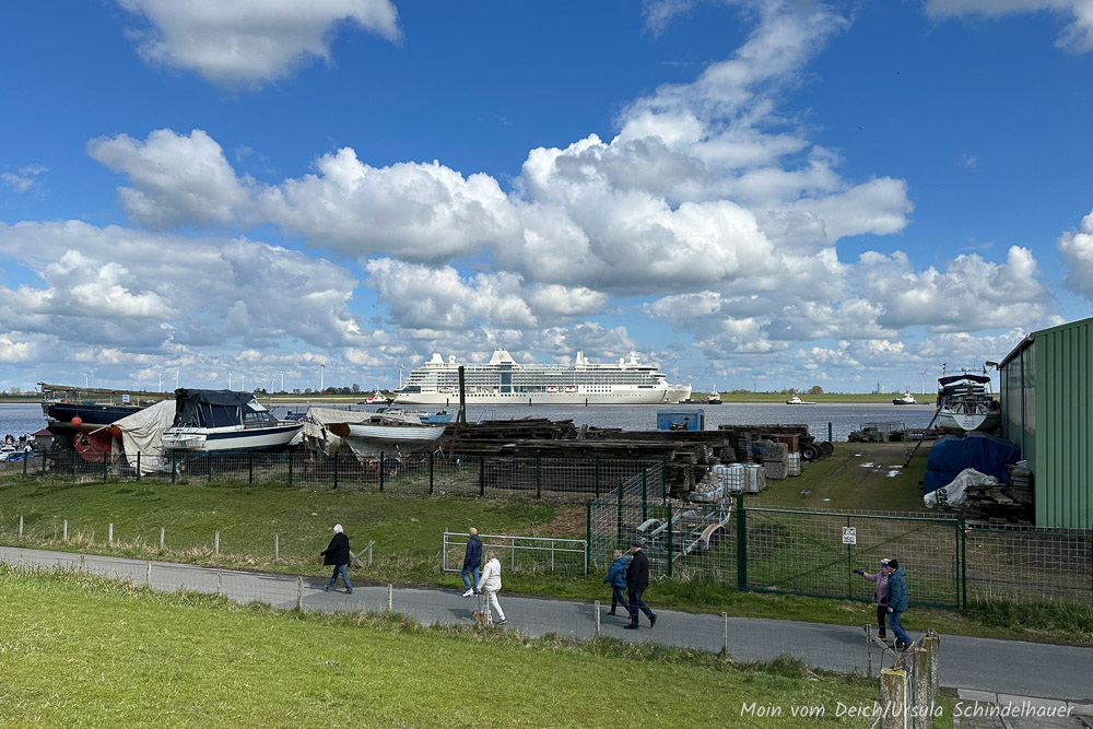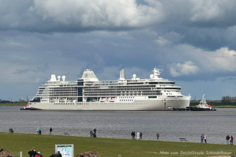 Heute war es wieder soweit: Die Meyer Werft in Papenburg hat ihr neuestes Kreuzfahrtschiff in die Nordsee überführt. Dazu wird das Schiff rückwärts mit Hilfe von zwei Schleppern von Papenburg aus die Ems entlang manövriert, natürlich auch an Ditzum vorbei.