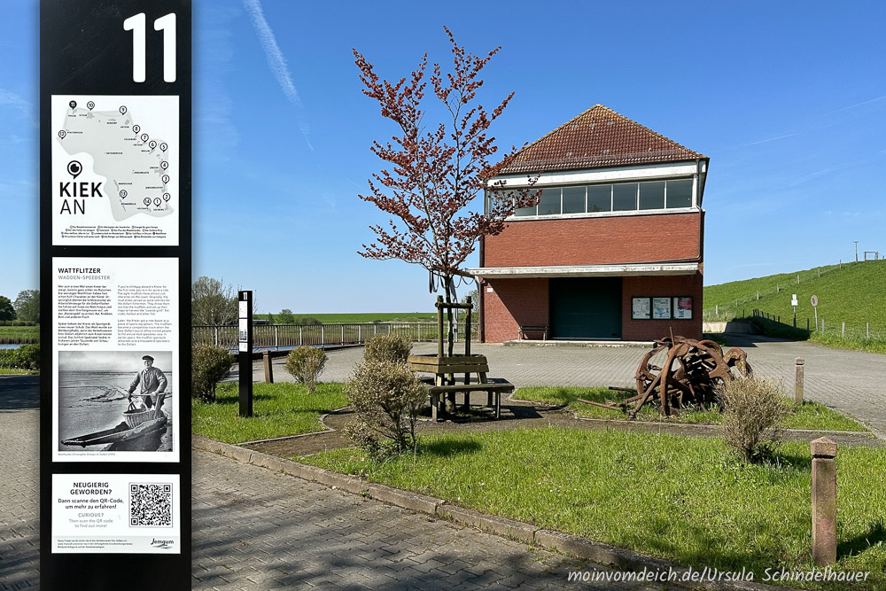 In der Gemeinde Jemgum gibt es seit kurzem eine neue Rad- und Erlebnistour, die auf den Namen 'Kiek an' hört. Diese Tour besteht aus 14 Haltepunkten in der Gemeinde, an denen es jeweils etwas Besonderes zu erfahren gibt. An jedem Haltepunkt gibt es eine Stele, auf der Infos zu lesen sind, aber es gibt auch einen QR-Code, den man mit dem Smartphone abscannen und sich dann weitergehende Infos erzählen lassen kann, auf Deutsch, Niederländisch, Englisch und Platt. Am Pogumer Schöpfwerk steht auch eine solche Stele; ihr Thema sind die 'Wattflitzer', also die Kreier, mit denen früher der Fischfang im Watt des Dollart betrieben wurde.