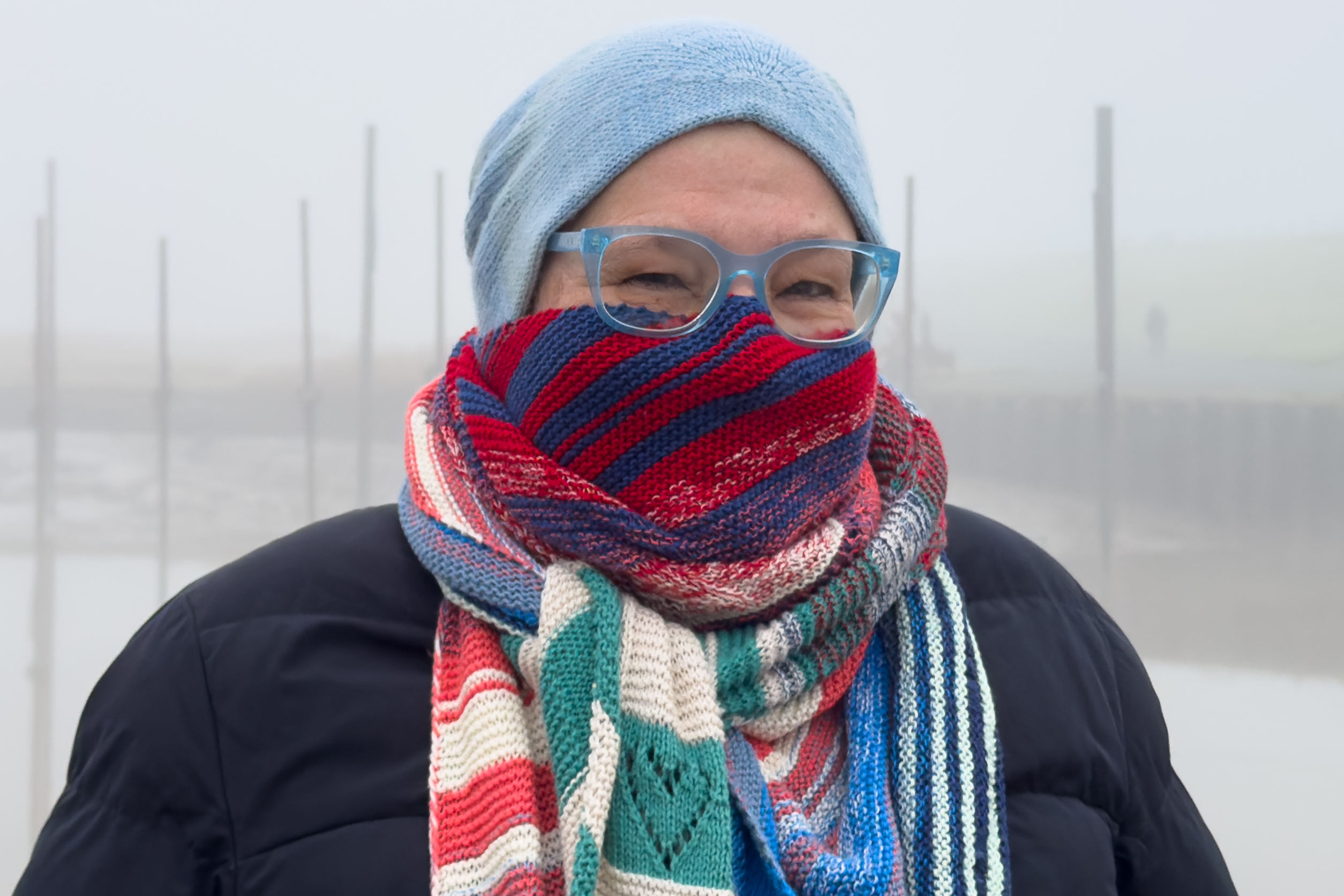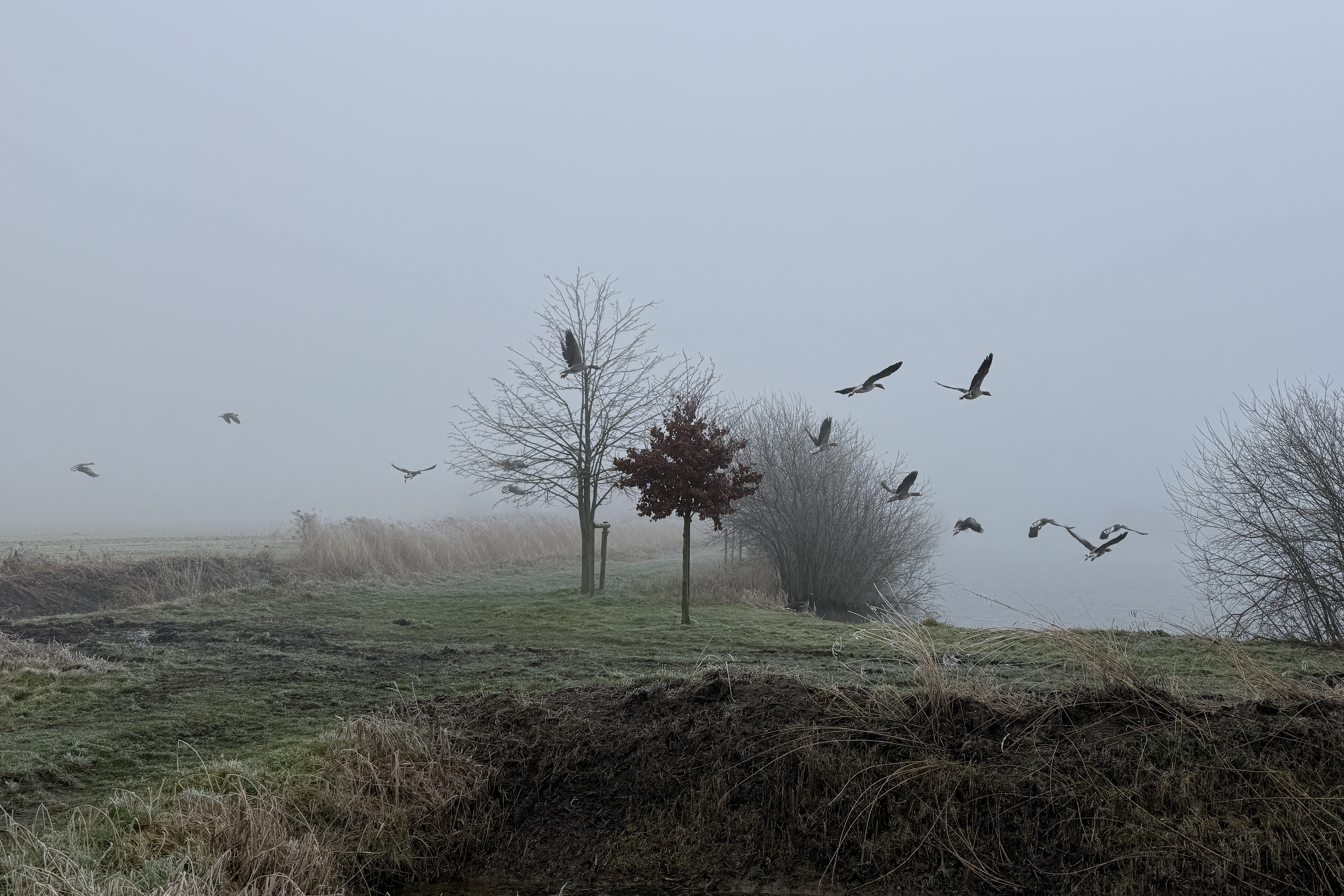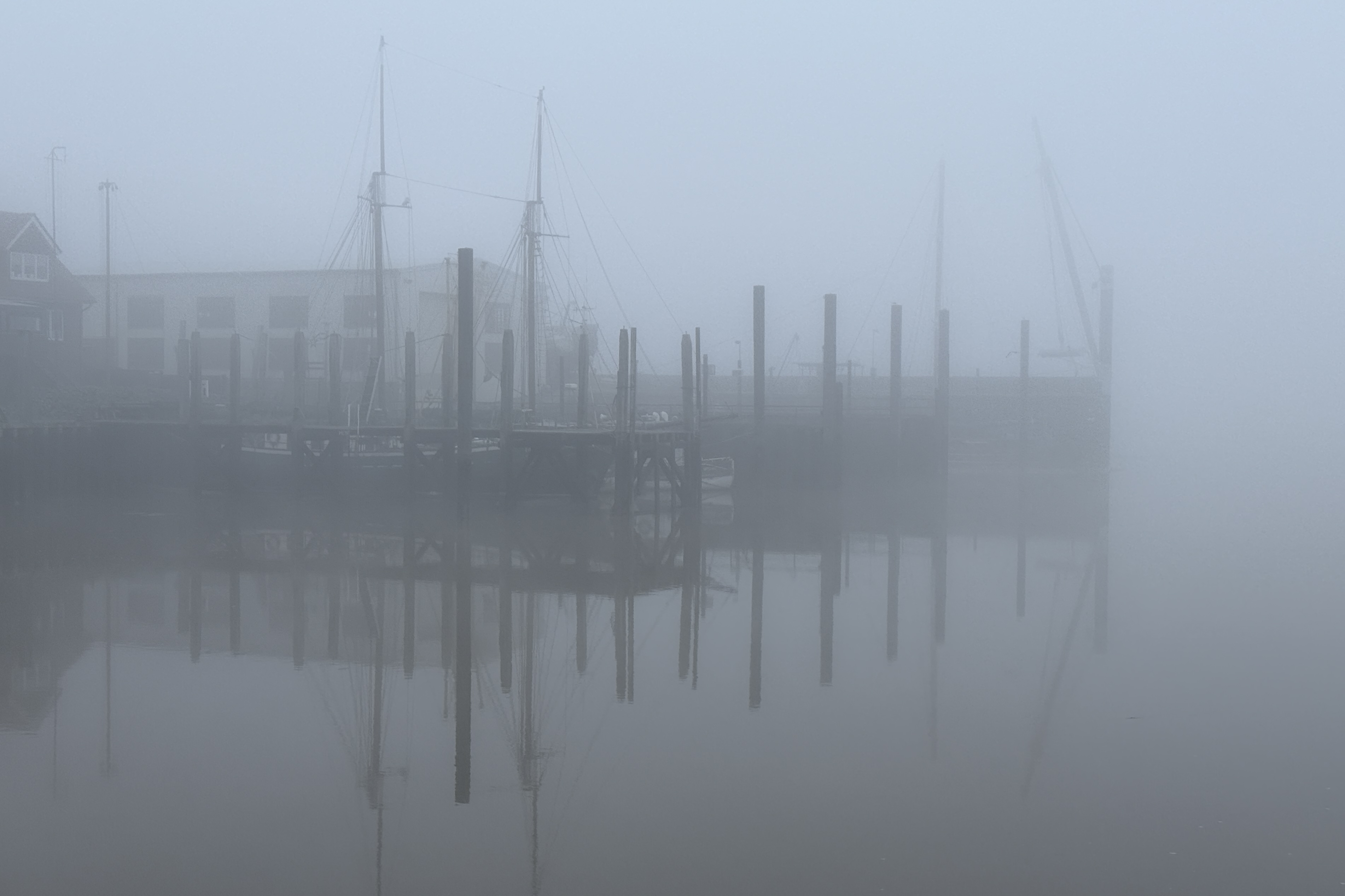 Winterhalme. Normalerweise sieht man dahinter in der Ferne das Emssperrwerk. Wetterbedingt ist es samt Ems verschwunden.