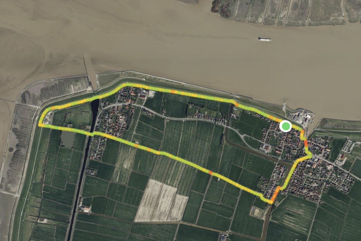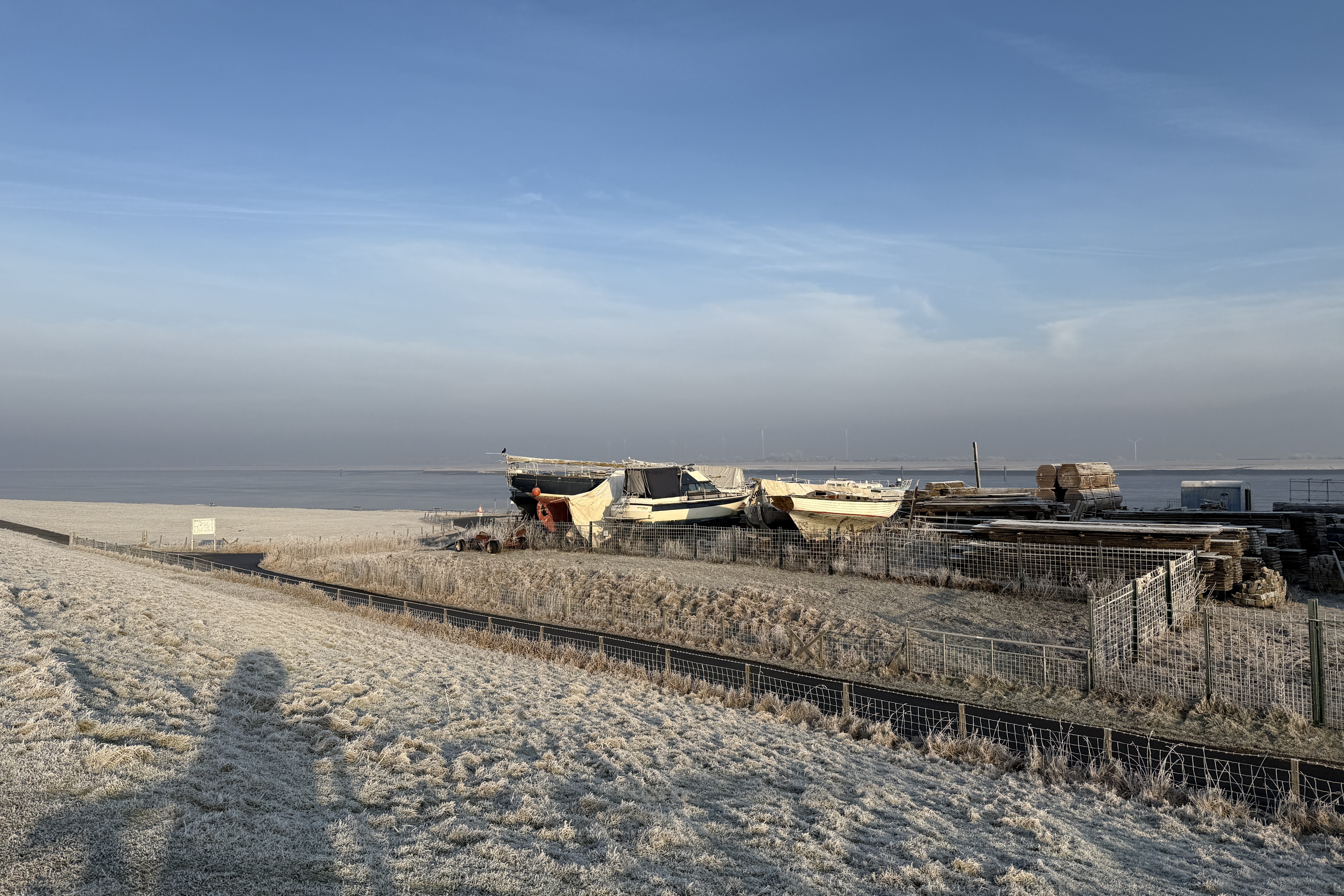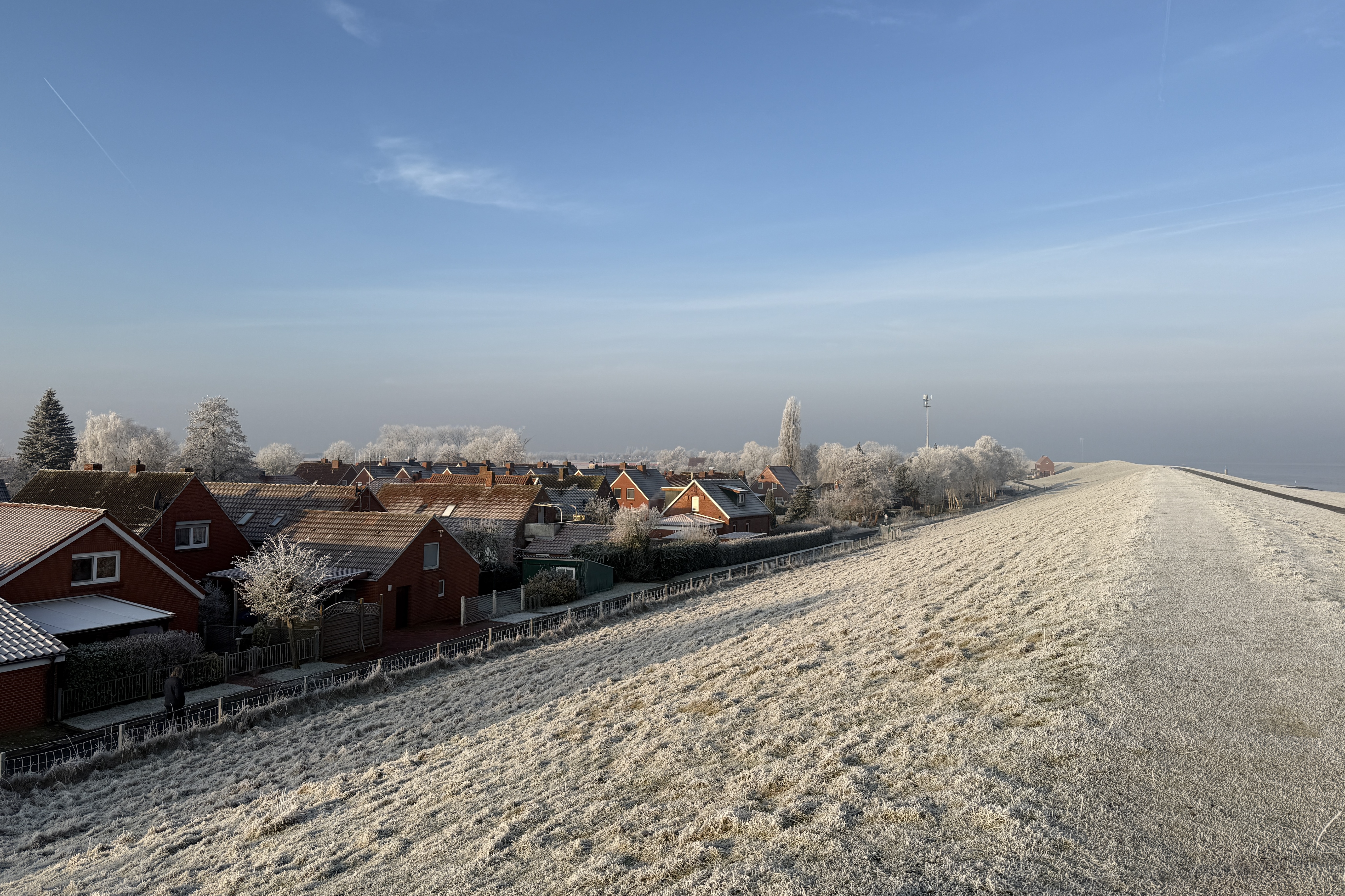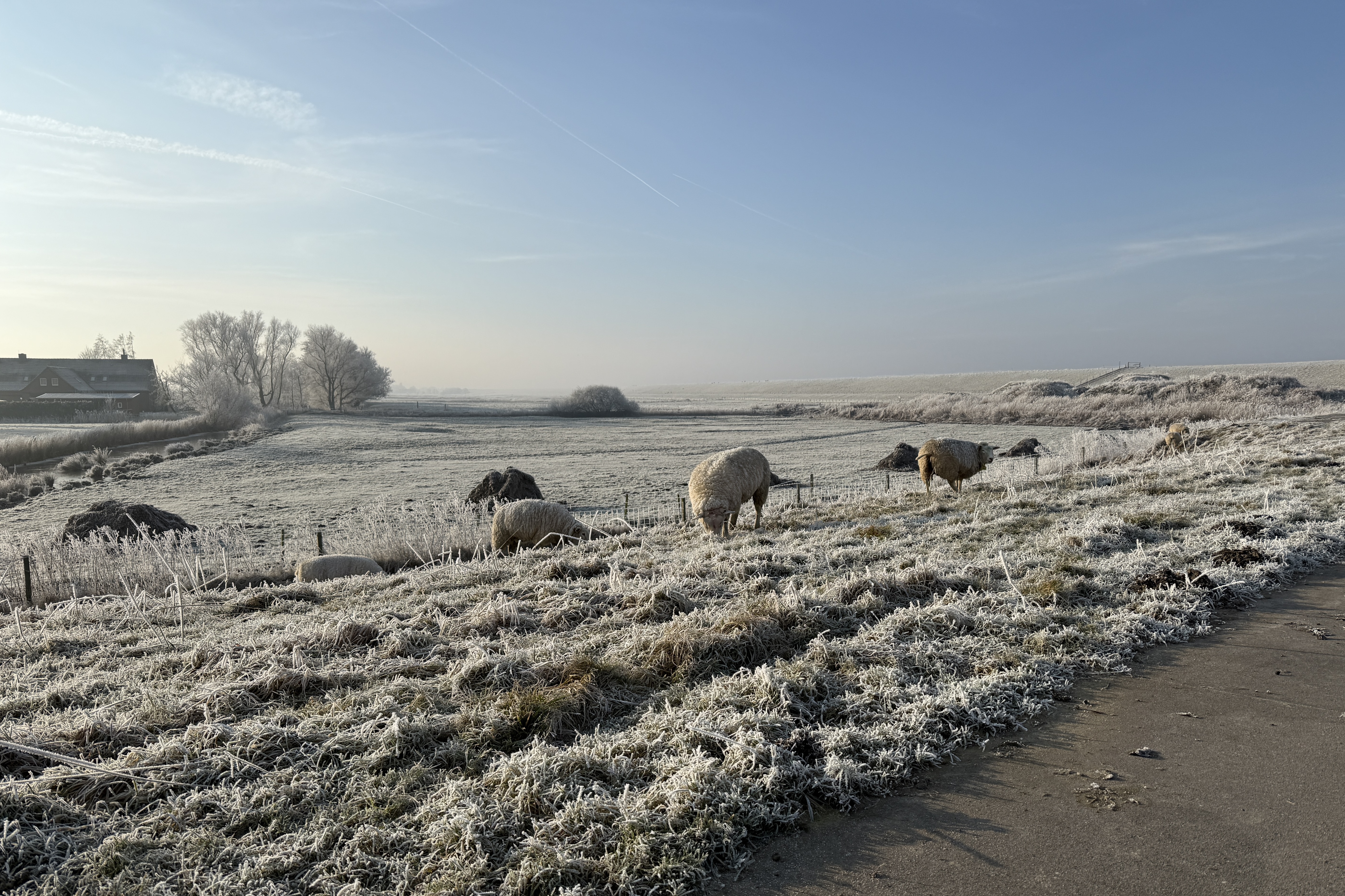 Eigentlich wollten wir ja nur mal kurz auf den Deich und gucken, wie es von da oben aussieht, aber als wir da oben standen, haben wir beschlossen, zumindest eine kleine Runde zu drehen. Als wir dann am Sperrwerk waren, sind wir nicht nach links abgebogen, Richtung zurück, sondern wir sind nach Pogum weiter gelaufen, und da dann ganz außen rum, am Pogumer Kolk vorbei und durch die Felder zurück. Am Sportplatz sind wir dann auch nicht links abgebogen auf den direkten Weg nach Hause, sondern wir sind noch das Sieltief entlang und ein bisschen durchs Dorf gelaufen. Und am Ende war aus unserem ‚Mal kurz auf den Deich und gucken‘ eine traumhafte 5,5km-Runde geworden.